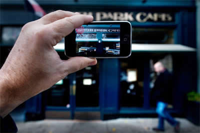 | Ứng dụng AR cho iPhone hiển thị các đánh giá về nhà hàng khi người dùng hướng camera về phía nhà hàng đó. |