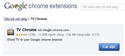 TV Chrome là extension của Google Chrome, cho phép xem trực tiếp các kênh truyền hình trực tuyến ngay trong cửa sổ trình duyệt. Các kênh truyền hình được sắp xếp theo nhiều chủ đề và theo từng quốc gia, trong đó có cả Việt Nam.